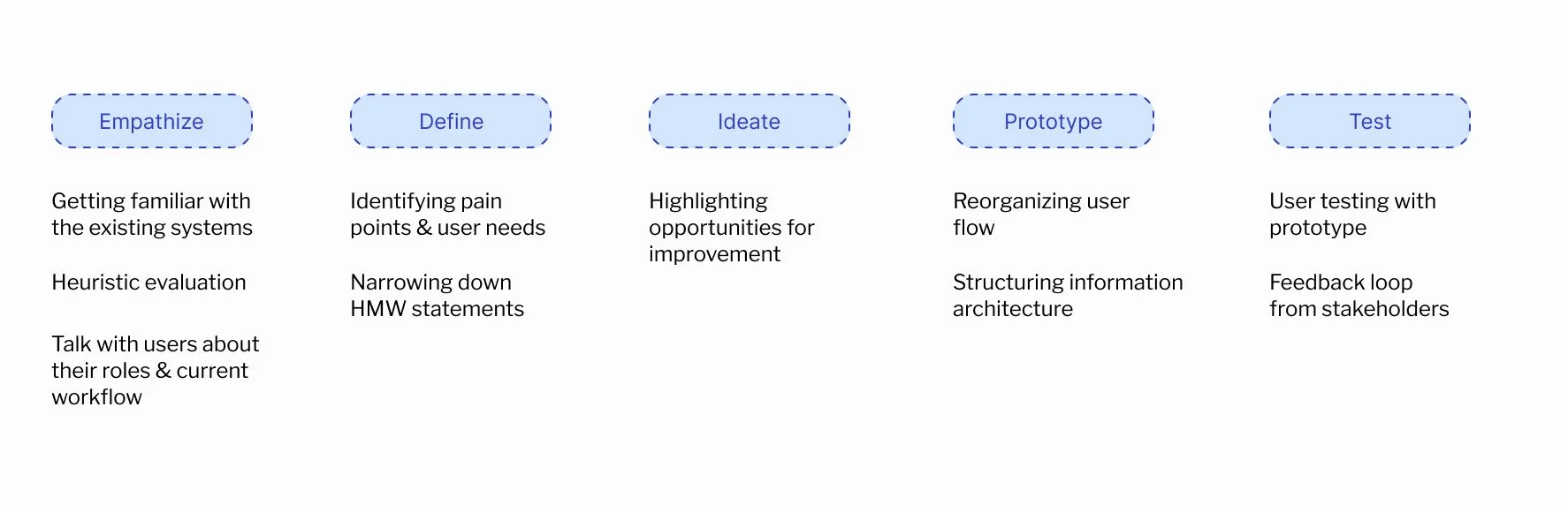 This is the design thinking process I followed & the actions I took in each phase. As many designers can attest, the process was iterated and went back to different stages before the feature was ready for development.